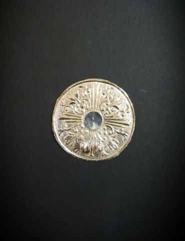 Material orfebreria,plateada. Su tamaño es de 5cm de diametro.