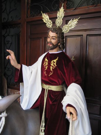 JESUS ENTRADA TRIUNFAL EN JERUSALEM. IMAGEN REALIZADA EN MADERA TALLADA Y POLICROMADA AL OLEO CON VESTIMENTAS EN TERCIOPELO BORDADO.. AUTORIA BAMBALINA.
