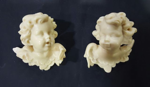 PAREJA DE QUERUBINES, REALIZADOS EN PASTA DE MARFIL, TAMAÑO 7X6.5 CM, PRECIO 24 EUROS.